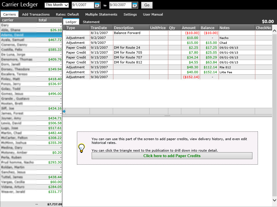 Our carrier compensation system fully supports the independent carrier relationship. It can handle draws, advances, supplies, adjustments, and just about anything else you can think of. It also features attractive printed statements that include as much detail as you want.