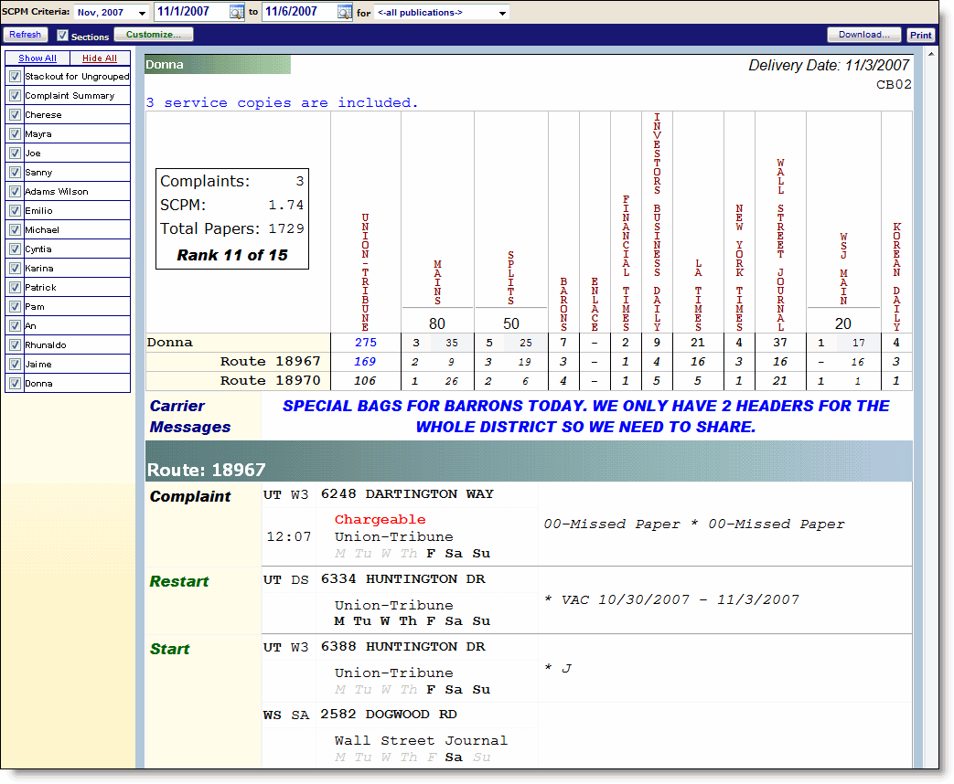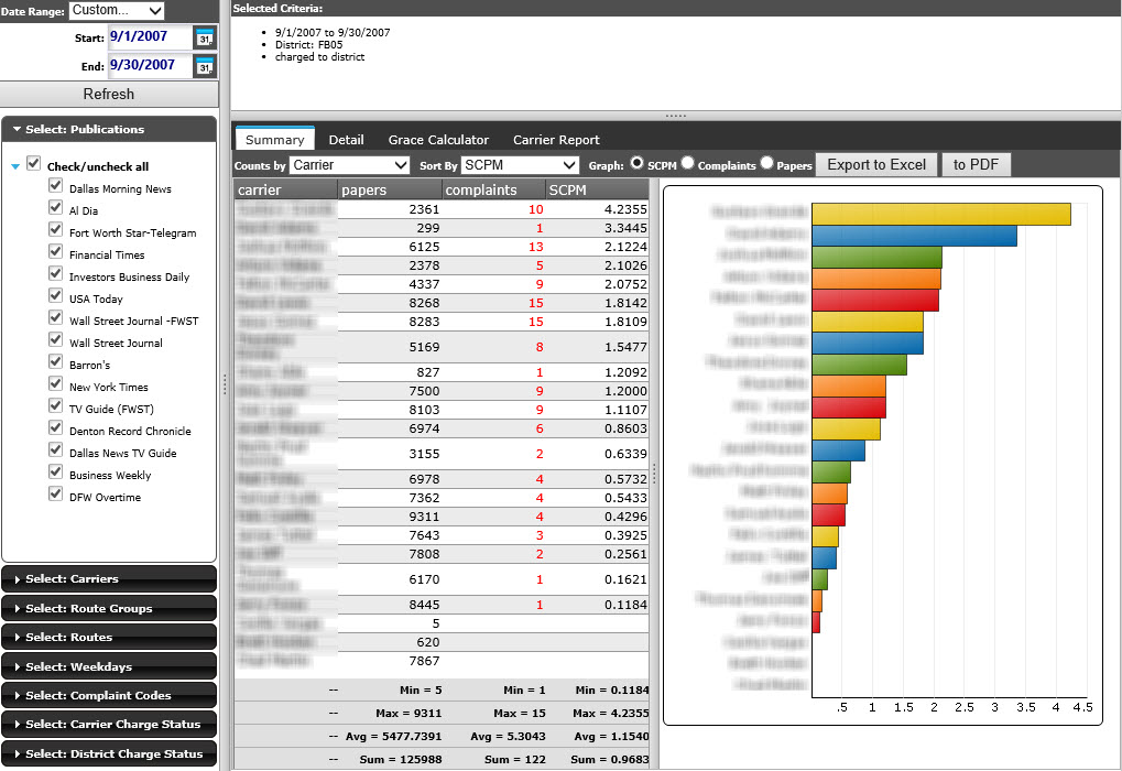 Use our Complaint Reporting tools to manage service levels across all publications, complaint codes, and carriers. Take advantage of built-in SCPM ranking of carriers to manage incentives and contests.